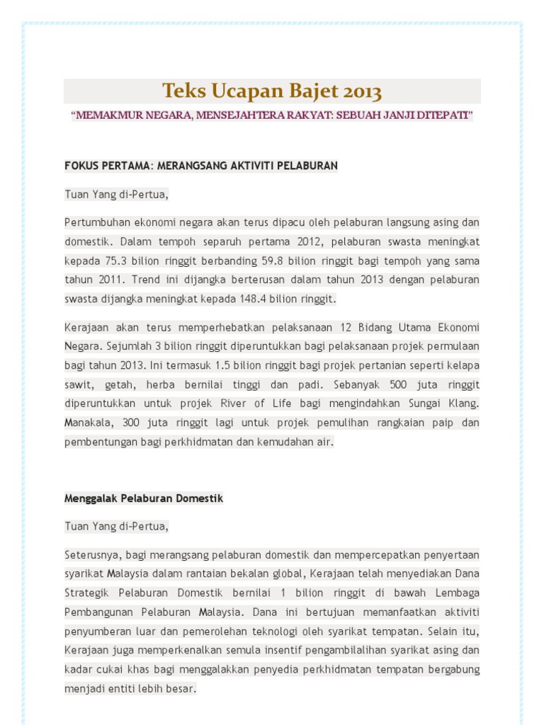 Teks Ucapan Bajet 2013 Fokus Pertama Merangsang Aktiviti Pelaburan