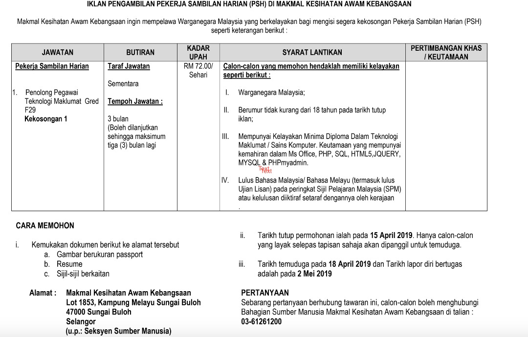 Iklan Jawatan Kosong Di Makmal Kesihatan Awam Kebangsaan Appkerja Malaysia