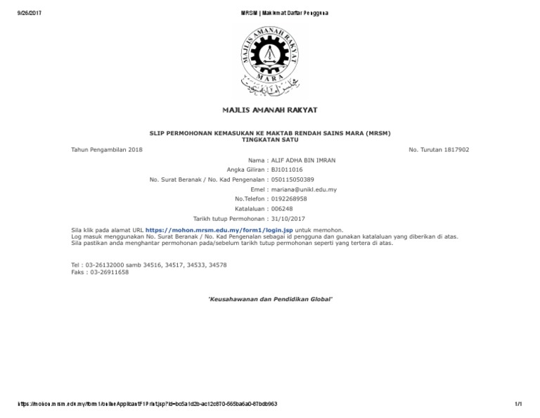 Permohonan Kemasukan Mrsm 2017 Tingkatan 1 Online As