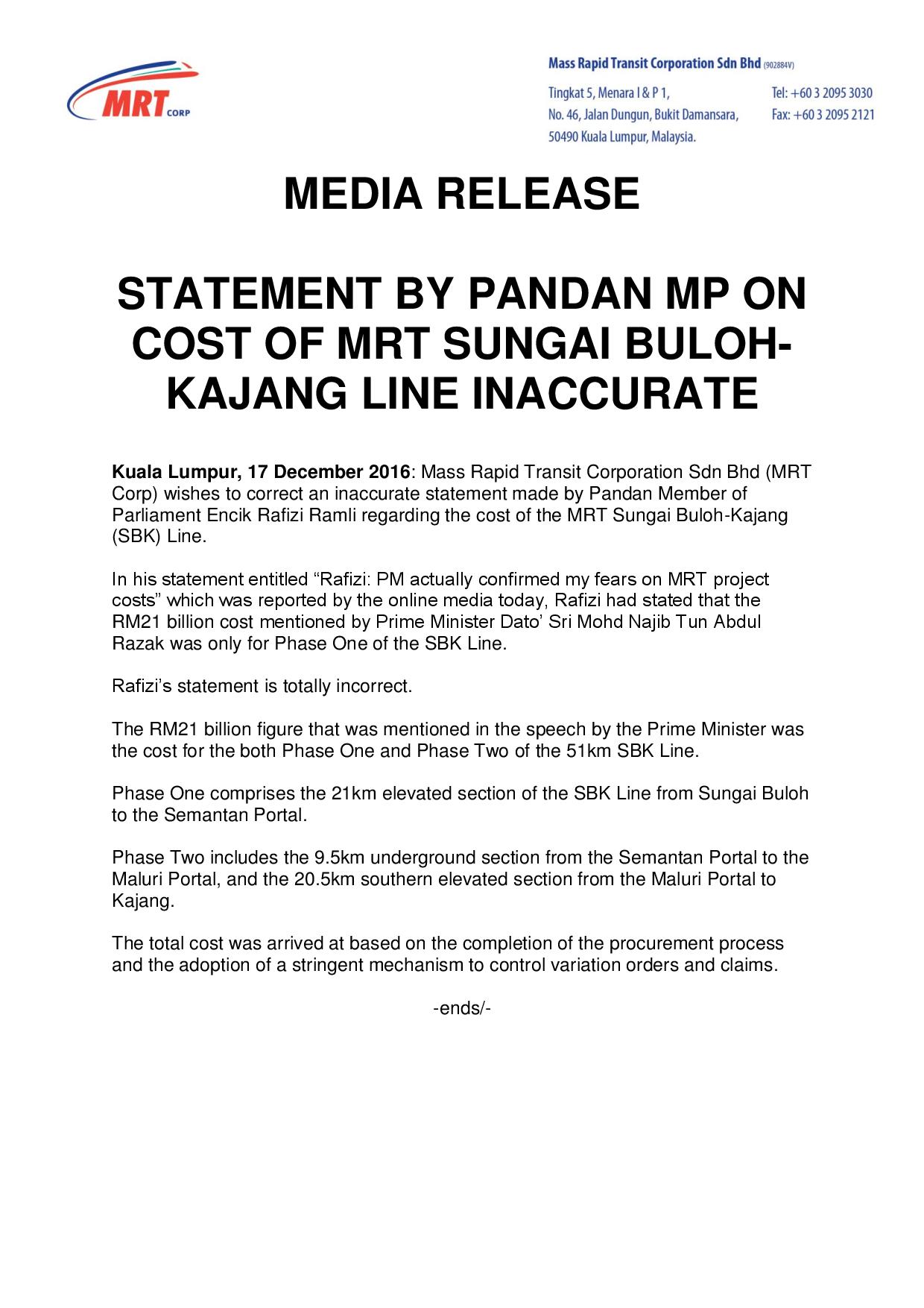 Mrt Corp On Twitter Statement By Pandan Mp On Cost Of Mrt Sungai Buloh Kajang Line Inaccurate
