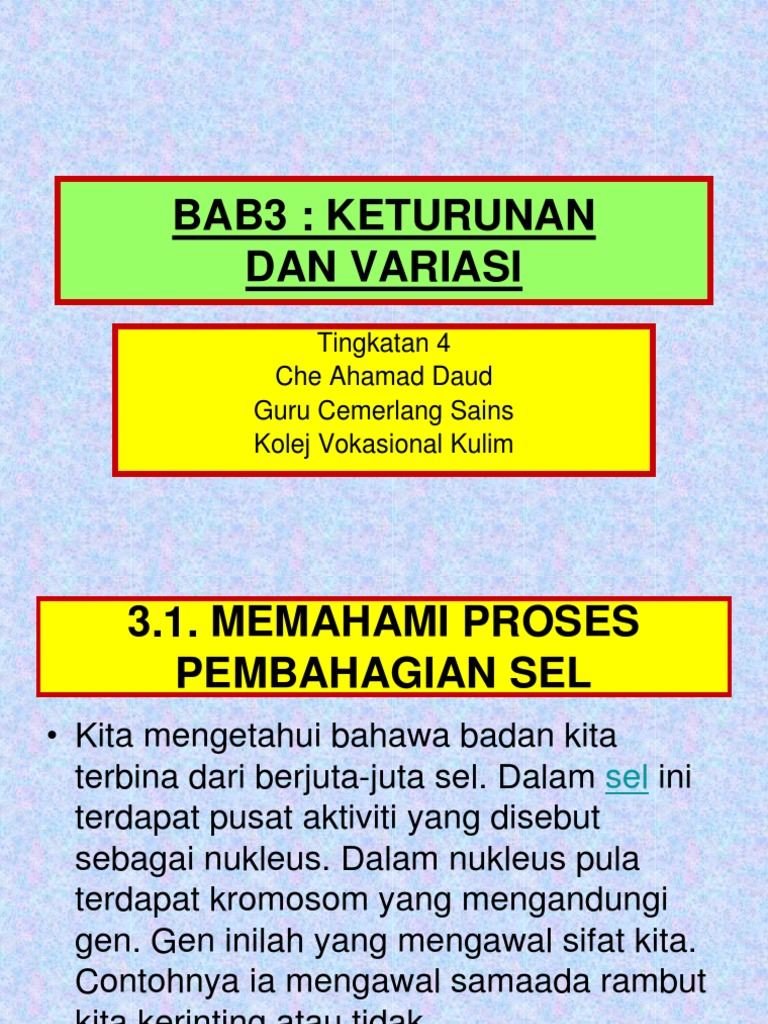 Sn T4 Dwibahasa Bab 3 Cikgu Che Ahamad Daud Bab3 Keturunan Dan Variasi Tingkatan 4 Che Ahamad Daud Guru Cemerlang Sains Kolej Vokasional Kulim 3 1 Course Hero