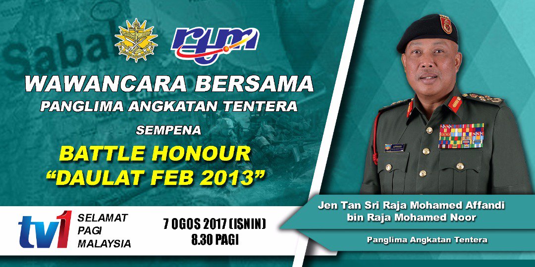 Mindef Malaysia On Twitter Saksikan Wawancara Bersama Panglima Angkatan Tentera Sempena Battle Honour Daulat Feb 2013 Pada 7 Ogos 2017 Isnin Jam 8 30 Pagi Https T Co Wen6ltobpq