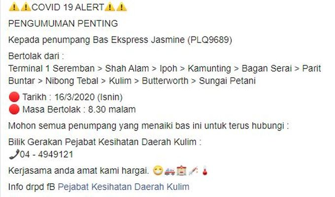 Pejabat Kesihatan Cari Penumpang Bas Jasmine Plq 9689 Dari Seremban Ke Sg Petani 16 Mac 2020 Buzzkini